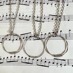 A small length of guitar string braided to form a circle 2-3cm in diameter, bound with silver plated wire, and hung from an 18 inch silver tone chain.
